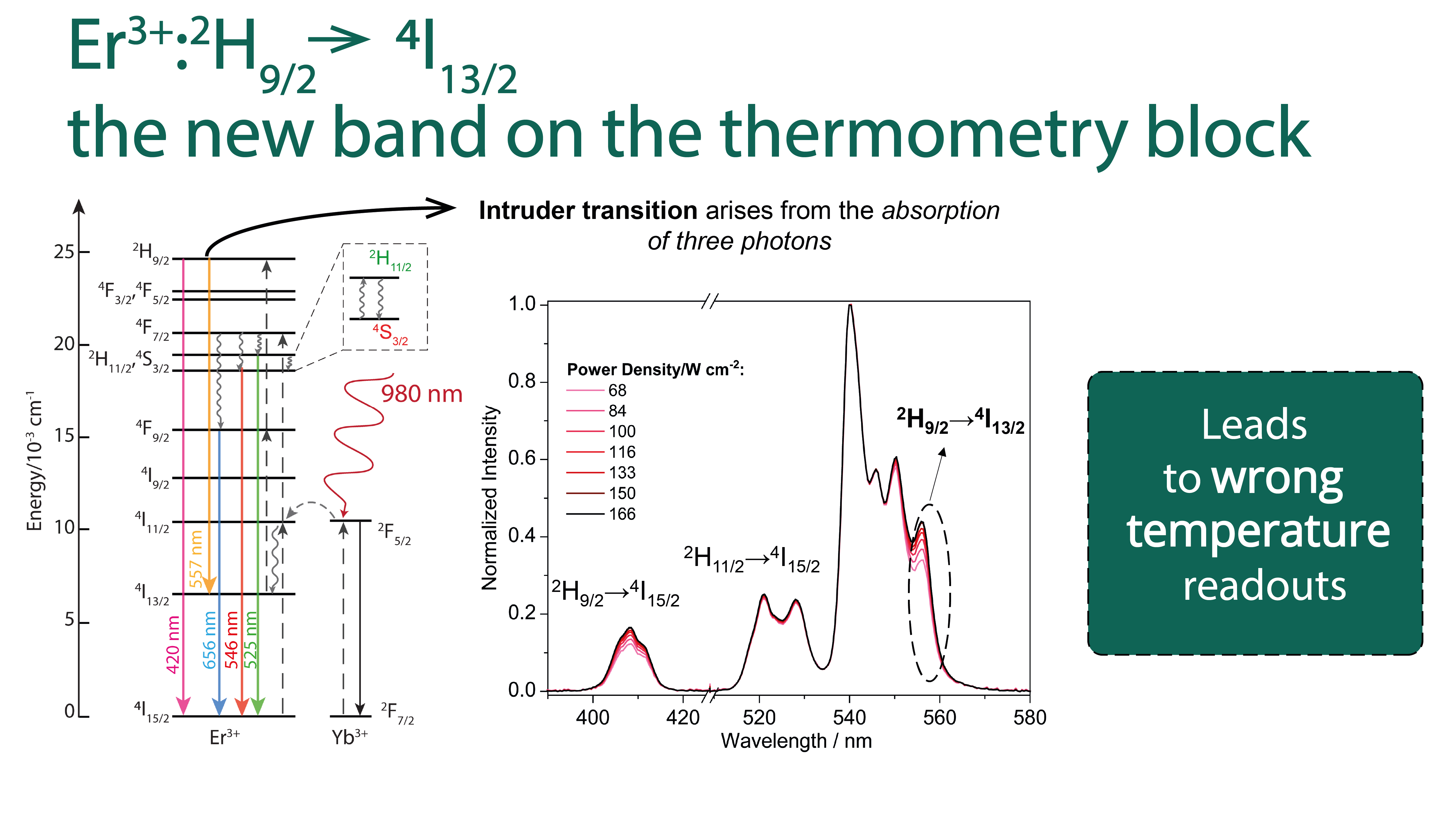 The use of the of the 2H11/2→4I15/2 and 4S3/2→4I15/2 Er3+ transitions in luminescent ratiometric thermometers have been widely reported for several years. However, very recently, several works have drawn attention to the presence of the 2H9/2→4I13/2 Er3+ transition within 4S3/2→4I15/2 emission range, then can induce distorted temperature readouts. In this work, we’ll further study its implications and how we can mitigate them.