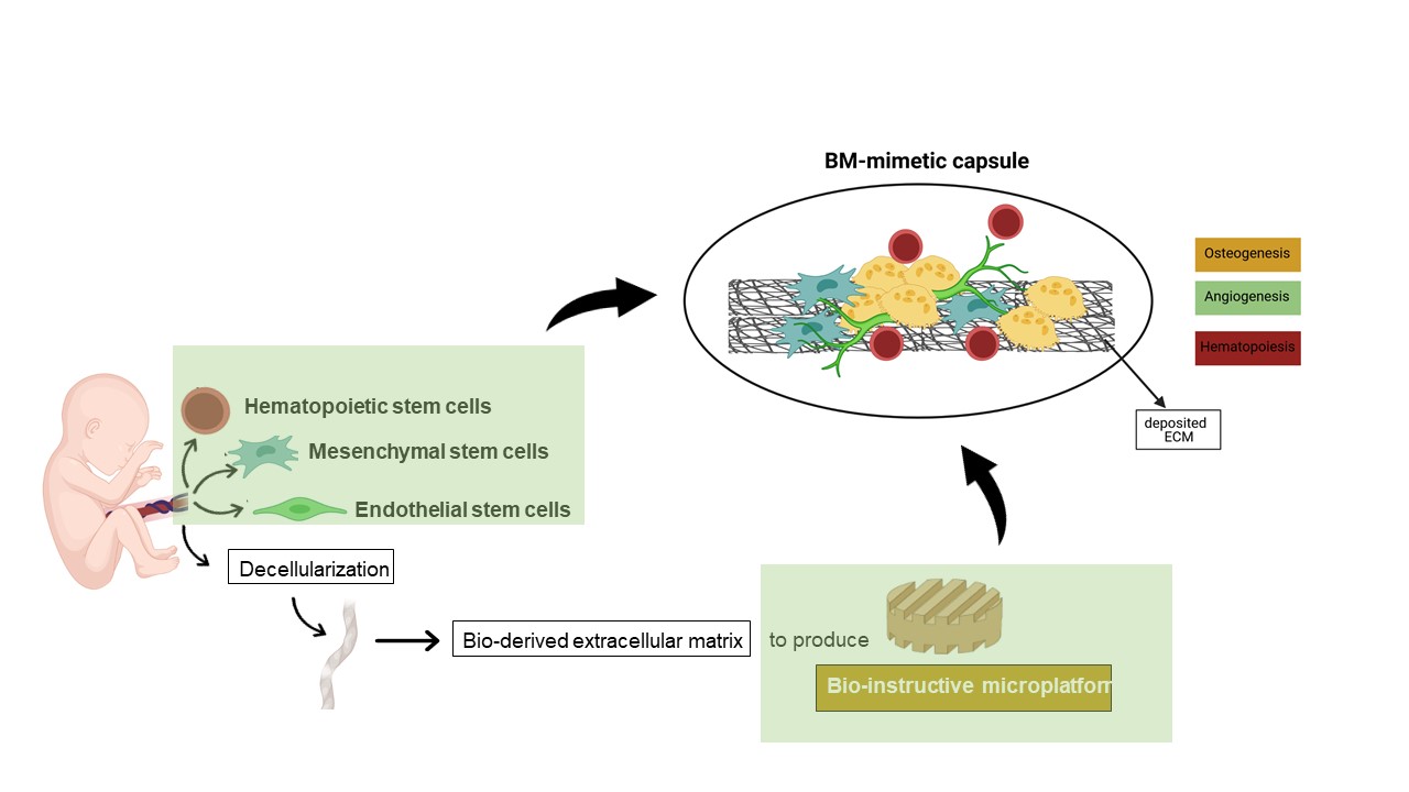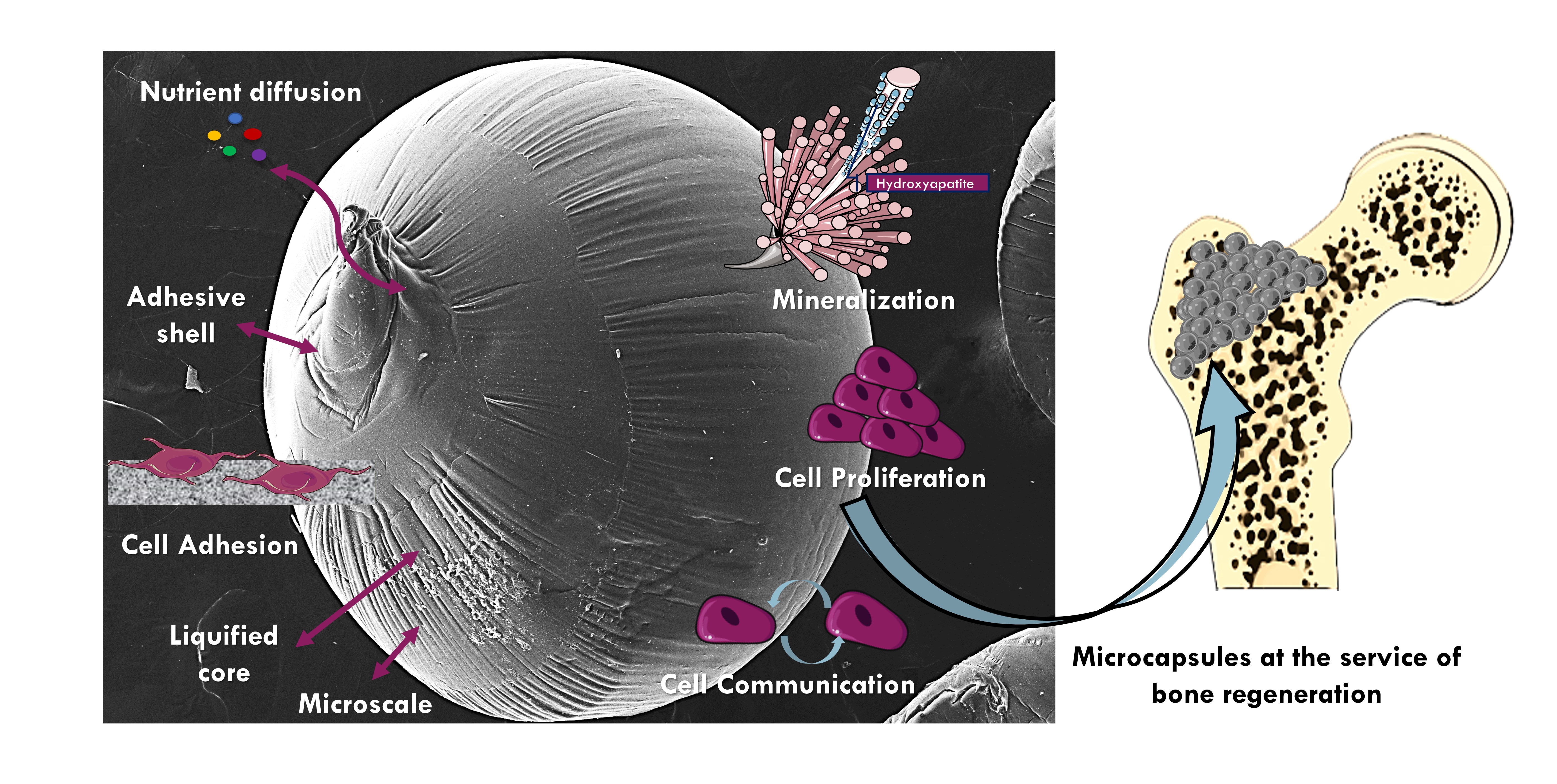 Bone tissue engineering (BTE) provides a plethora of temporary scaffolds to be implanted at the defect site untilbone is endogenously regenerated and the biomechanical function is restored. The majority of BTE strategies aredeprived of an integrated strategy that combines the three co-existing systems of the native bone marrow (BM)microenvironment, namely skeletal, vascular and hematopoietic. The novelty of the present project is to combinethese three systems in liquefied compartments as a revolutionary and promising strategy to recreate theregenerative properties of the BM in vitro. For that, multiphenotypic cells will be strategically combined with bio-instructive microplatforms comprising topographical and stiffness cues and encapsulated in liquefied-corecapsules. The main hypothesis is that by providing cells the structural, biological and bio-instructive requirements,a self-regulated and vascularized bone-like microtissues could be engineered.