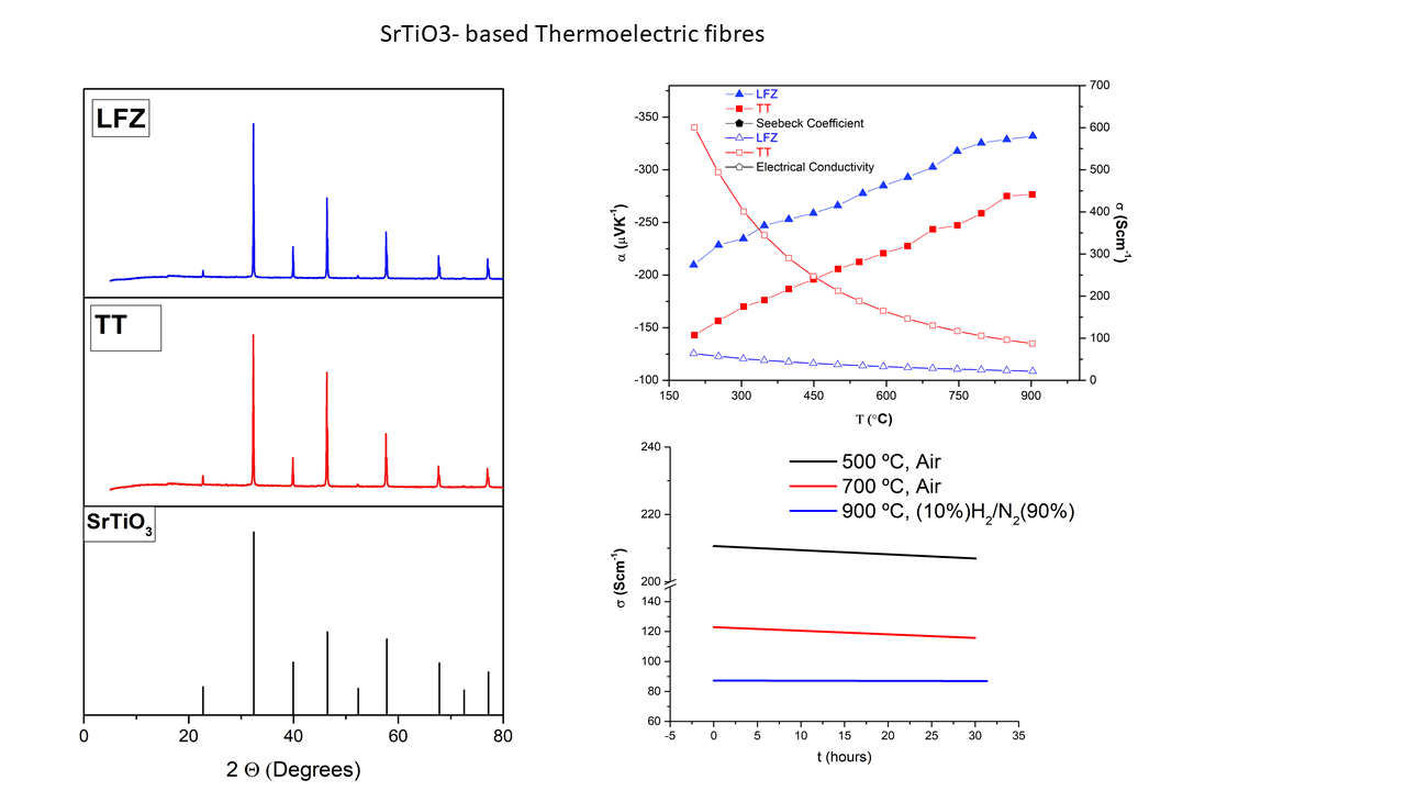 Twitter PosterThermoelectric technology has a great potential to contribute to the challenge of recoveringwaste heat if efficient, cheap and environmentally friendly thermoelectric materials aredeveloped [1]. Semiconducting oxides [2] with appropriate electrical and thermal transportproperties are based on abundant, mostly non-toxic elements, in opposition to traditionalthermoelectrics. Oxides show great promises for the conversion of waste heat from nuclearstations, thermal power plants, combustion engines and exhaust gases of high-temperatureindustries [1]. SrTiO3 is a promising TE oxide as confirmed from previous TE studies of SrTiO3single crystals [3,4]. Undoped SrTiO3 is an insulator with no free electrons, but when dopedwith a small amount of a rare earth element like La, becomes an n-type semiconductor withmetallic behaviour [5]. Electron-doped SrTiO3 has a large ZT not only because of its relativelyhigh electrical conductivity but also a large Seebeck coefficient induced by high carrier mobilityand large effective mass. Although its ZT is less than 1 because of its large thermal conductivity,La-doped SrTiO3 is one of the best n-type oxide thermoelectric materials [6]. A majorchallenge in developing highly efficient thermoelectric materials is seeking a delicate balancebetween functional properties, like electrical/ thermal conductivities and Seebeck coefficient.The Laser Floating Zone method was employed for processing some thermoelectrical materials,showing significant prospects for enhancing performance [7]. The ability to produce highlydense fibers, aswell as the formation of metastable phases during growth make this technique agreat process to obtain high performance oxide thermoelectric materials.References[1] R. Freer, A. V. Powell, Realising the potential of thermoelectric technology: A Roadmap, J.Mater. Chem. C. 8 (2020) 441–463. https://doi.org/10.1039/c9tc05710b.[2] M. Backhaus-Ricoult, J. Rustad, L. Moore, C. Smith, J. Brown, Semiconducting large bandgapoxides as potential thermoelectric materials for high-temperature power generation?, Appl.Phys. A Mater. Sci. Process. 116 (2014) 433–470. https://doi.org/10.1007/s00339-014-8515-z.[3] T. Okuda, K. Nakanishi, S. Miyasaka, Y. Tokura, Large thermoelectric response of metallicperovskites: Sr1−xLaxTiO3 (0 ≤ x ≤ 0.1), Phys. Rev. B - Condens. Matter Mater. Phys. 63 (2001)3–6. https://doi.org/10.1103/PhysRevB.63.113104.[4] S. Ohta, T. Nomura, H. Ohta, K. Koumoto, High-temperature carrier transport andthermoelectric properties of heavily La- Or Nb-doped SrTiO 3 single crystals, J. Appl. Phys. 97(2005). https://doi.org/10.1063/1.1847723.[5] I. Suzuki, Bando, Hiroshi, Ootuka, Youiti, H.Inoue, Superconductivity in Single-Crystalline Sr1-xLaxTiO3, J. Physical Society of Japan (1996), https://doi.org/10.1143/JPSJ.65.1529.[6] G. Ren, J. Lan, C. Zeng, Y. Liu, B. Zhan, S. Butt, Y.H. Lin, C.W. Nan, High Performance Oxides-Based Thermoelectric Materials, Jom. 67 (2015) 211–221. https://doi.org/10.1007/s11837-014-1218-2.[7] F.P. Carreira, N.M. Ferreira, A. V. Kovalevsky, Laser processing as a tool for designing donor-substituted calcium manganite-based thermoelectrics, J. Alloys Compd. 829 (2020) 154466. https://doi.org/10.1016/j.jallcom.2020.154466.