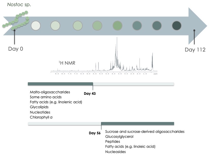 Cyanobacteria are often considered a factory of added-value compounds. However, knowledge about the array of interesting compounds that could be extracted from these prokaryotic organisms is still very limited. Nuclear Magnetic Resonance (NMR) spectroscopy is a widely used technique for metabolic profiling that allows an overview of the main metabolites present in complex biological matrices. In this work, high resolution 1H NMR was applied to the freshwater cyanobacterium Nostoc sp., and used to screen the production of metabolites demanded by several biotechnological applications. The growth and metabolic profile of Nostoc sp. were monitored during 112 days. Not only this species showed an incredible longevity, being able to grow for more than one hundred days without any medium supplementation, as it proved to be a source of valuable compounds. During the period of study, several interesting metabolites were detected, such as several sugars and oligosaccharides, lipids (e.g., glycolipids, ω-3 and ω-6 fatty acids), amino acids, including mycosporin-like, peptides, and pigments (e.g., chlorophyll a and carotenoids). Owing to the long-term monitoring implemented in this study, the production of these compounds could be associated to specific moments of the growth of Nostoc sp., providing new insights into the most appropriate harvesting time points for the biotechnological exploitation of specific molecules.