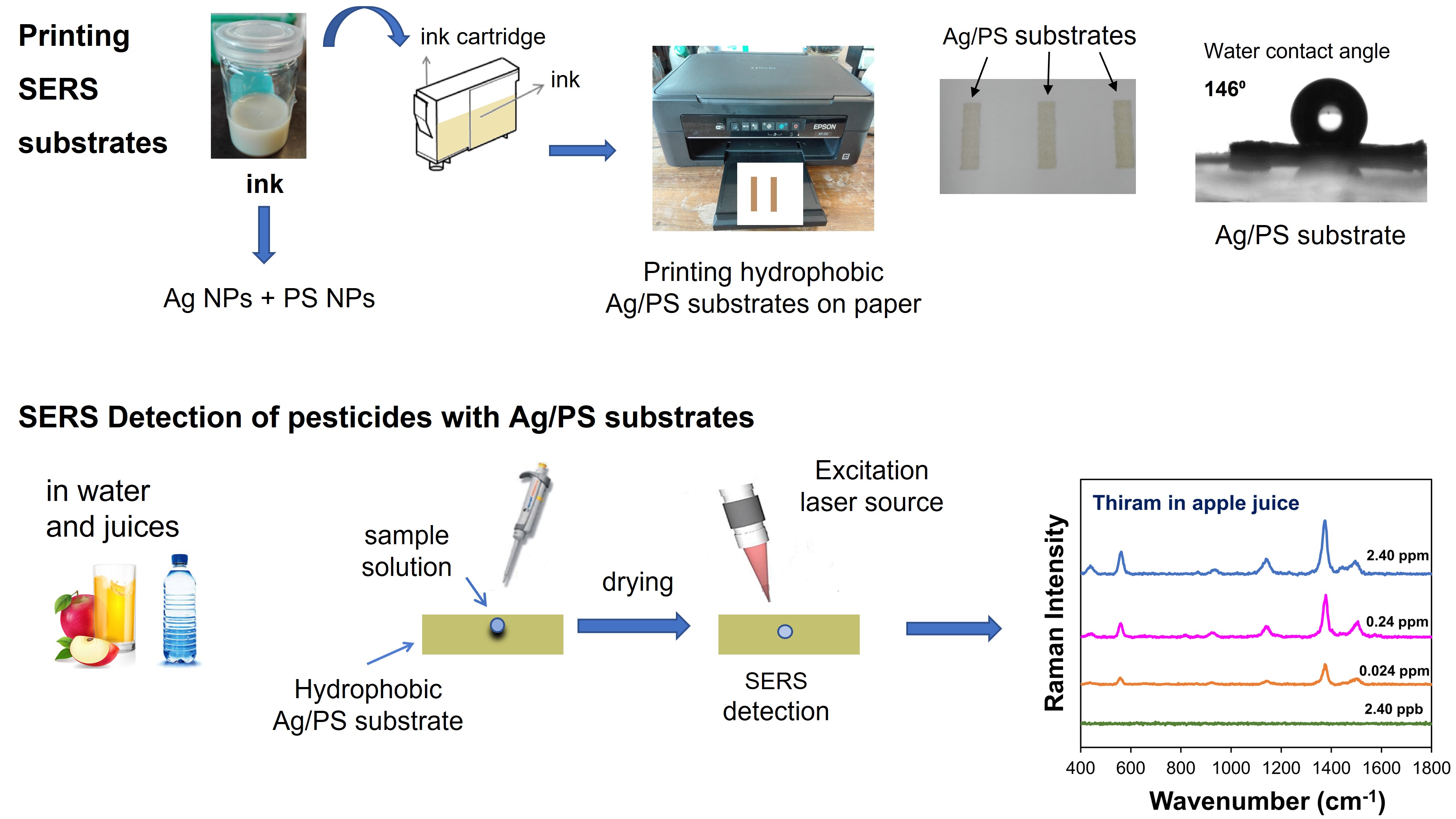 Monitoring trace levels of pesticides in food products is extremely important as a preventive measure for protecting public health. In the past years, surface enhanced Raman scattering (SERS) has been explored as a non-conventional method in the detection of trace chemical species in water and food, namely for the presence of vestigial pesticides. The use of materials that act as highly sensitive substrates in SERS is a crucial requirement in this type of surface analysis. In particular, hydrophobic SERS substrates are attracting significant attention, because in certain conditions allow the analyte molecules to concentrate in a smaller area of the sensor, thereby increasing its sensitivity. In this work, we propose an innovative strategy to prepare hydrophobic paper-based substrates for SERS analysis. The substrates have been manufactured by inkjet printing of formulations containing Ag colloids and polystyrene (PS) beads emulsions. The optimization of the substrates for SERS analysis was performed by varying parameters such as the weight % of PS in the ink formulation and the number of printing cycles. Several samples have been studied, including fruit juice and fruit peels spiked with the pesticide thiram. Using the new hybrid SERS substrates, thiram was detected in spiked water and apple juice at a level of 24 ppb, while in apple peel, the detection limit achieved was 600 ng/cm2. As such, the paper-based SERS substrates allowed the detection of thiram in laboratorial samples at concentrations lower than the MRL established by the European Union (Commission Regulation (EU) 2016/1).