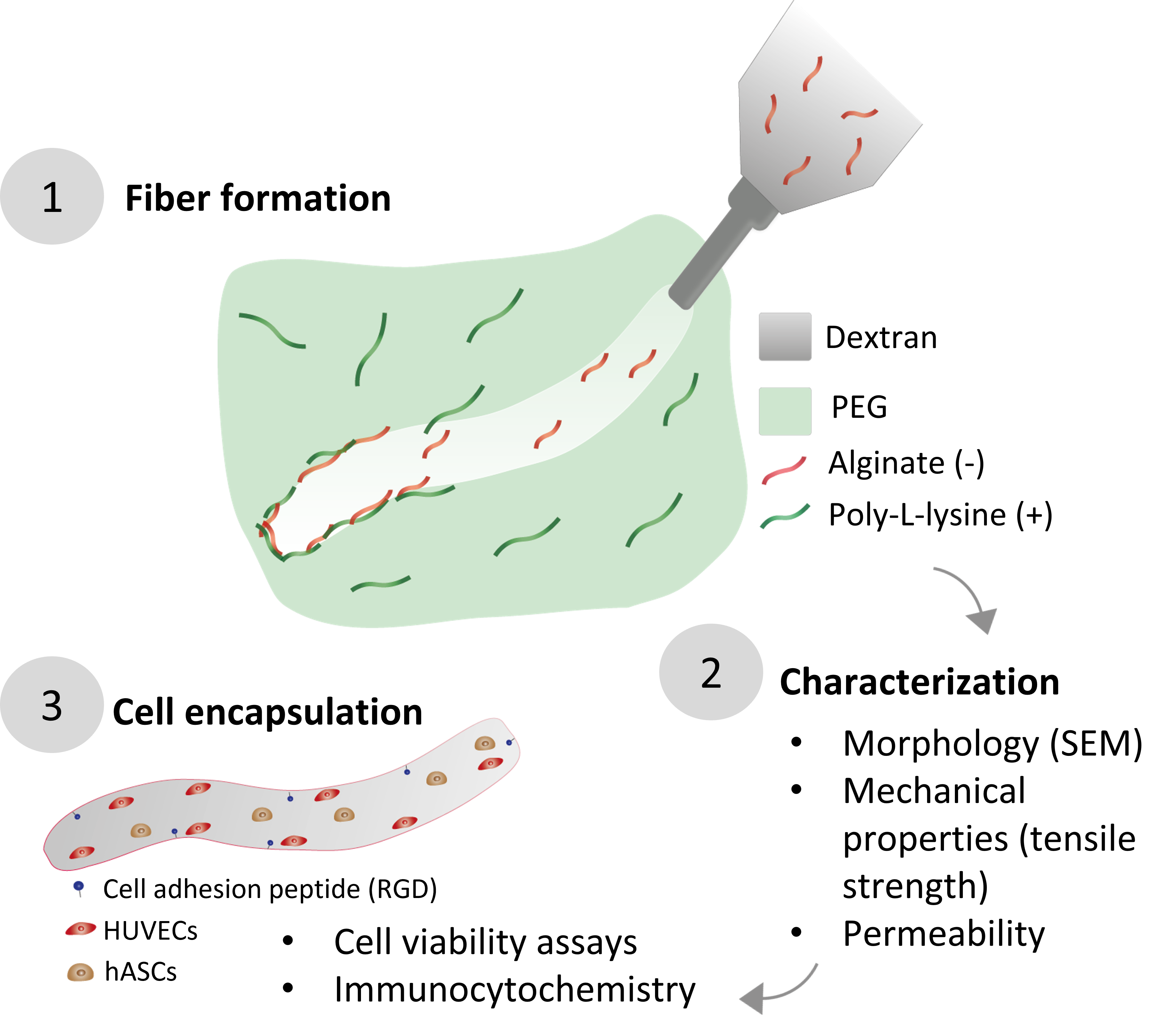 Tissue engineering strategies based on cell encapsulation in biomaterials have been reporting to improve efficacy of regenerative therapies. Tubular materials capable of supporting cell functionality and recapitulating native tissues such as blood vessels have been purposed as alternative approaches to classical spherical-shaped cell encapsulation materials. Several biofabrication techniques have been explored for the generation of tubular materials; however, they often require specialized equipment, and/or rely on time-consuming and multistep procedures.Herein, a poly(ethylene glycol) (PEG)/dextran-based aqueous two phase-system (ATPS) was used to support the direct and rapid generation of fibers with hollow features in a single step. The addition of oppositely charged polyelectrolytes in each phase, enabled their complexation at the ATPS interface, forming a stabilizing membrane. The morphology and mechanical properties of the structures were characterized, as well as the membrane permeability to fluorescent molecules with different molecular weights. Human adipose-derived stem cells (hASCs) and umbilical vein endothelial cells (HUVECs) were successfully encapsulated in optimized formulations, also modified with cell adhesive groups. Tubular perfusable materials with tunable mechanical properties and increased permeability were able to be produced. Moreover, encapsulated cells remain viable up to 7 days, with vascular endothelial cells surviving for 14 days of cell culture. This work brings new perspectives in the field of regenerative medicine presenting an easy to implement approach for the rapid generation of cytocompatible materials able to support the growth of relevant human cells with regenerative properties.