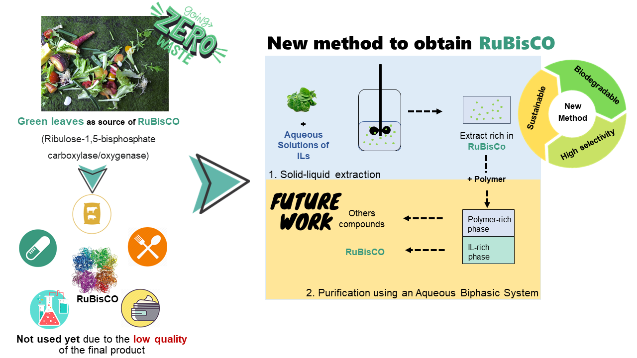 RuBisCO (Ribulose-1,5-bisphosphate carboxylase/oxygenase) is the most abundant protein on Earth. Commonly, RuBisCO is applied in the feed industries as a protein source, and in the future, its peptides can be applied in nutraceuticals and functional foods. However, the current methods used for RuBisCO extraction lack sustainability. In this work, a new extraction method of RuBisCO from biomass was developed. Aqueous solutions of biocompatible ionic liquids (ILs) were used, and a response surface methodology was applied to optimize the extraction conditions. Under optimum conditions, extraction yields of 10.92 and 10.57 mg of RuBisCO/ g of biomass were obtained with cholinium acetate ([Ch][Ac]) and cholinium chloride ([Ch]Cl), respectively. When compared with the conventional solvent (NH4OH), the extraction yield results were better for the IL solutions. Moreover, the CD spectroscopy results showed that the secondary structure of the RuBisCO is better preserved in the IL solutions. Thus, as future work is planned the development of an integrated process for the separation and purification of the target enzyme.