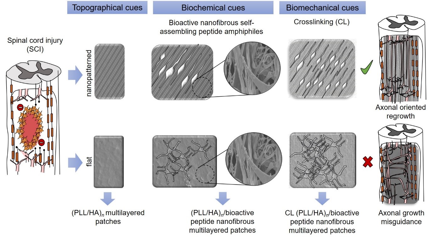 Spinal cord injury is a severe neurodegenerative disorder arising from traumatic damages inflicted on central nervous system (CNS), often resulting in a permanent loss of motor function and sensory perception. Despite the growing knowledge in understanding the lesion pathophysiology, there is not an effective therapy to promote functional recovery.Recently, the emerging field of supramolecular chemistry together with advances in nanotechnology, tissue engineering and regenerative medicine have paved the way for developing neural extracellular matrix (ECM)-mimetic biomaterials aimed at building up a pro-regenerative microenvironment at lesion site and triggering axonal repair. However, the developed biomaterials still fail in recreating the complex composition, multiresponsive dynamic nature and mechanical robustness of native ECM.Herein, emphasis will be given to the supramolecular design of biomimetic multitactical nanobiomaterials, endowed with topographical, biomechanical, and biochemical cues, to recapitulate the diversity of signals in native CNS microenvironment and stimulate axonal regrowth and spinal cord repair. The bioinstructive biomaterials rely on biocompatible hyaluronic acid and poly(L-lysine) biopolymers, and laminin-mimetic biofunctional peptide, recreating neural ECM and promoting neurite outgrowth. The biomaterials were assembled on templates denoting distinct nanotopographies by combining molecular self-assembly with the cost-effective and highly versatile Layer-by-Layer assembly technology. The biomaterials were further crosslinked to enhance cell functions. The physicochemical and morphological properties of developed biomaterials will be disclosed, and their in vitro biological performance unveiled using primary neuronal cortical cells aiming to reveal their potential to stimulate axonal outgrowth and be used in spinal cord repair.