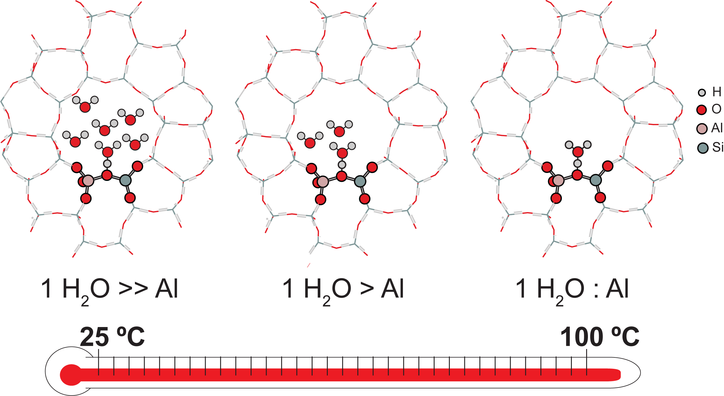 The many studies that have been conducted on water adsorption on zeolites were carried out in “adsorption”mode, from adsorption isotherms or single-point measurements, with the samples being first degassed at high temperature, and then exposed to water vapor at variable partial pressure. Here, we report Thermogravimetric Analysis (TGA) studies of HZSM-5 saturated with water at room temperature, thus studying water adsorption in “desorption” mode. TGA was used to ascertain the amount of water remaining as a function of the pretreatment temperature, and to identify the temperature at which one water molecule per framework Al atom persists. Solid-state 1H NMR spectroscopy, combined with molecular modeling, provided evidence for water molecules hydrogen-bonded to Brønsted acid sites and the formation of oxonium species for distinct water per framework Al atom. TGA is shown to be a simple and expeditious technique to measure the number of Brønsted acid sites in aluminosilicate zeolites, with advantages over the traditional methods of IR or TPD of dangerous adsorbed ammonia or pyridine. TGA of adsorbed water also provides information on the water clusters formed at the acid sites of HZSM-5, which are proportional to the number of acid sites.